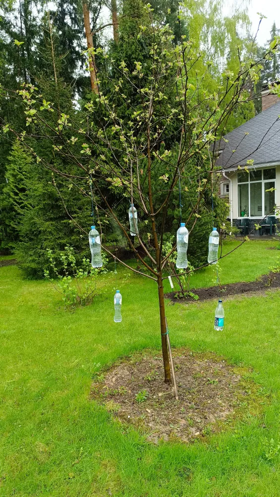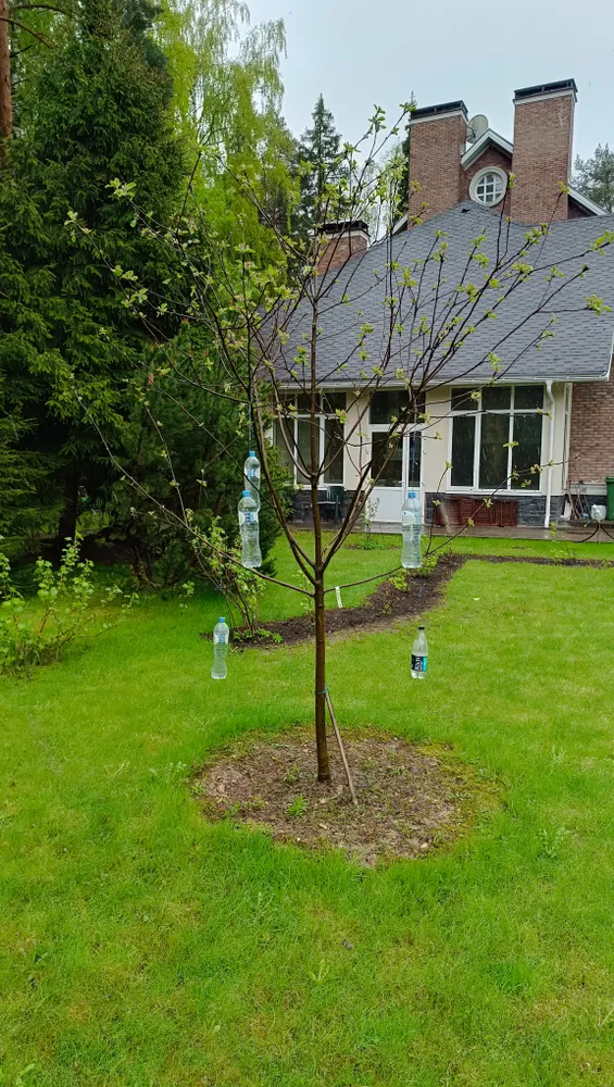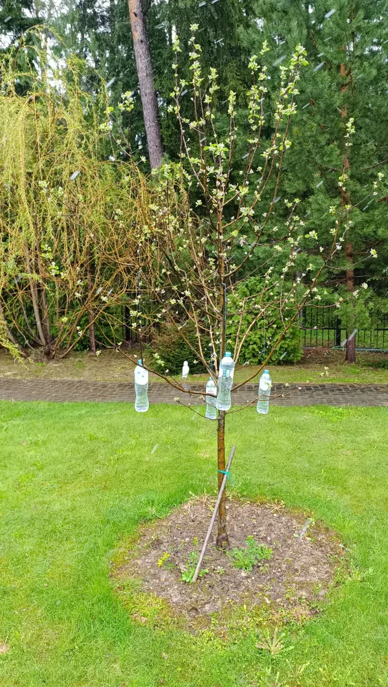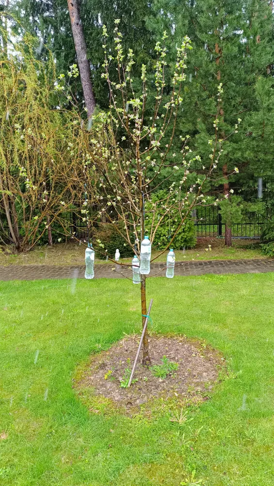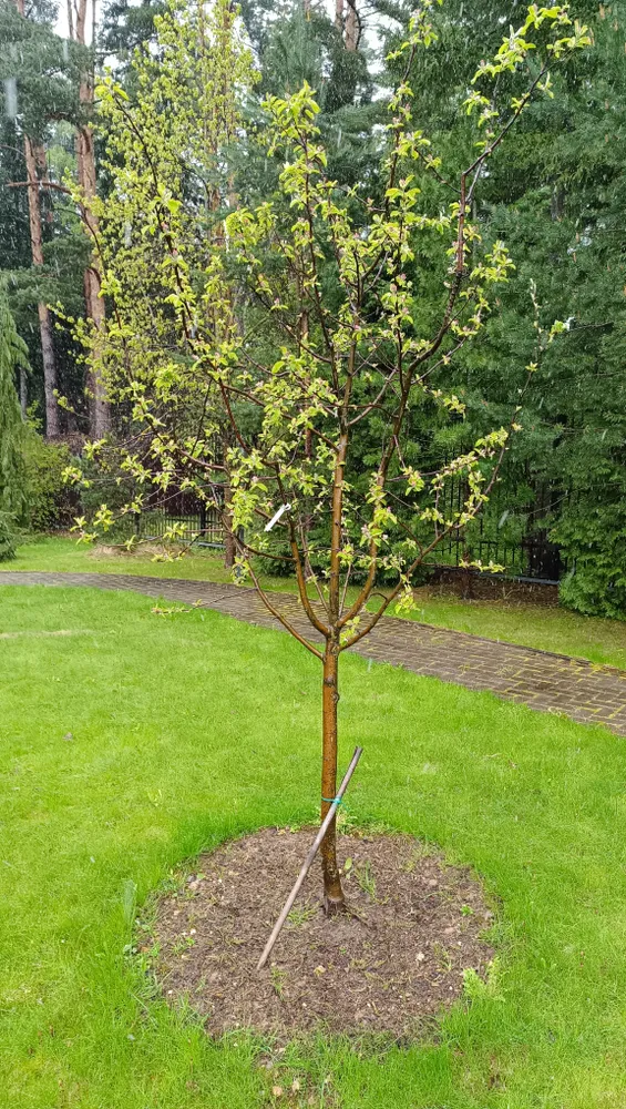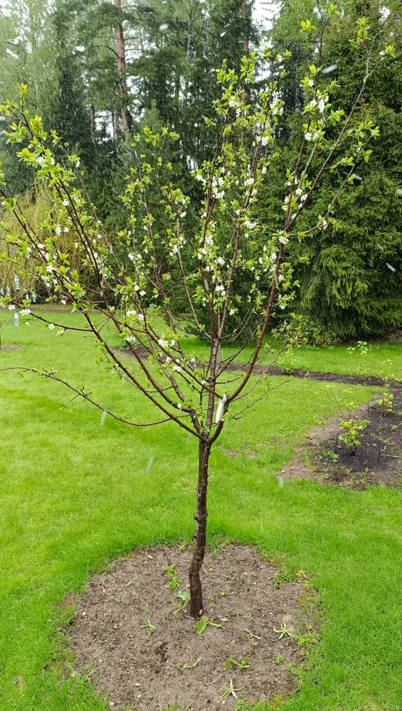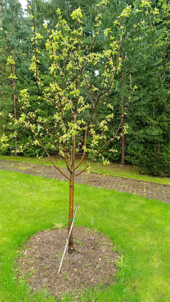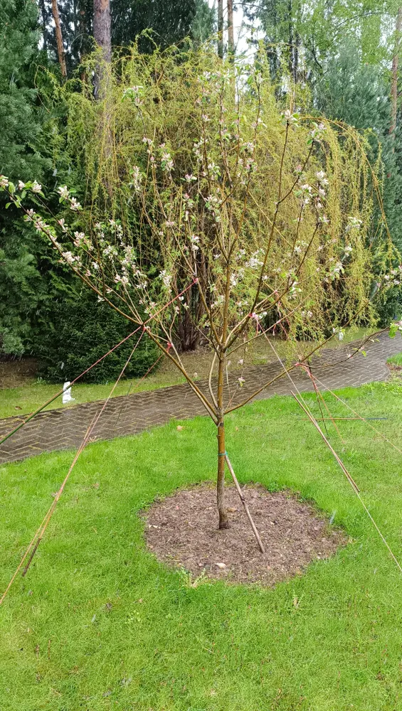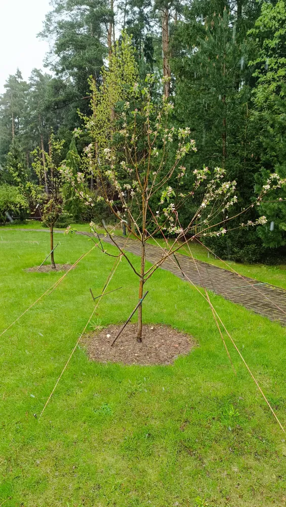Сад, через год после посадки, готовится зацветать. Крупномеры 7лет. Растяжка ветвей для большего плодоношения.