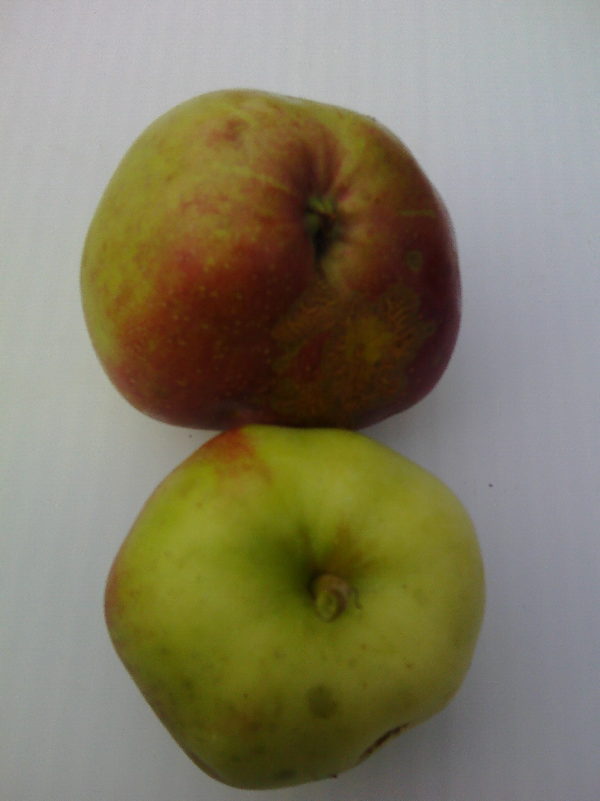 Форма плодов — шаровидная, слегка уплощенная. В чашечке четко видны 5 ребер, нередко они переходят и на плод. Кожица гладкая и блестящая. Плоды среднего размера (до 170 грамм). Основная окраска — желто-зеленая, на значительной части поверхности покрыта красно-карминовым румянцем. Мякоть — кисло-сладкая. Вкус — хороший.