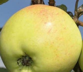 Плоды средней величины, овальные, кисло-сладкие, кожица светло-желтая с розовым размытым румянцем в виде полосок.