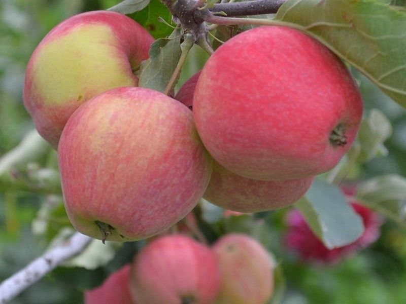 Плоды средней величины, 60–70 г, плоско-округлой формы, с ярко-красными полосами на фоне зеленовато-желтой основной окраски. Издали яблоки кажутся сплошь розовыми. Вкус сладкий.