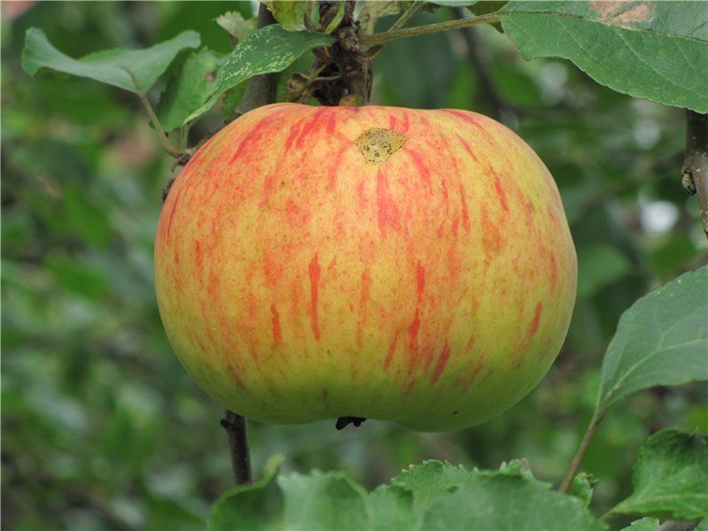 Плоды крупные, массой 130–250 г, округлые, при созревании приобретают зеленовато-желтую основную окраску, с полосатым красным румянцем почти по всей поверхности. Мякоть беловато-желтая, ароматная, десертного, кисло-сладкого вкуса.