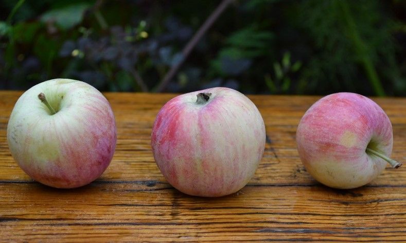 Плоды мелкие 50 – 130 г, форма округло-вытянутая. Поверхность плода гладкая, блестящая. Основная окраска светло-желтая, покровная – полосатый или размытый ярко-красный румянец.