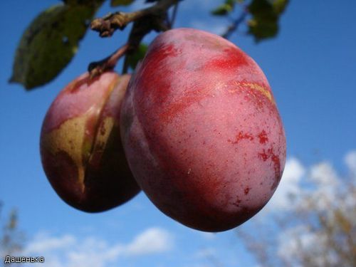 Плодоношение регулярное и обильное. Сорт частично самоплодный. Транспортабельность высокая. Плоды крупные. Массой 40-50 г, удлинённо-овальной формы. Окраска кожицы розово-красная с синевато-сизым восковым налётом и многочисленными тёмными подкожными точками. Кожица средней плотности, тонкая. Мякоть оранжевая, сочная, нежная, волокнистая, десертного кисловато-сладкого вкуса. Косточка полуотделяется, средней величины. Кожица сливы красная покрыта восковым налётом. Мякоть оранжевого цвета, сочная и нежная имеет кисло сладкий вкус. Косточка от мякоти отделяется плохо.